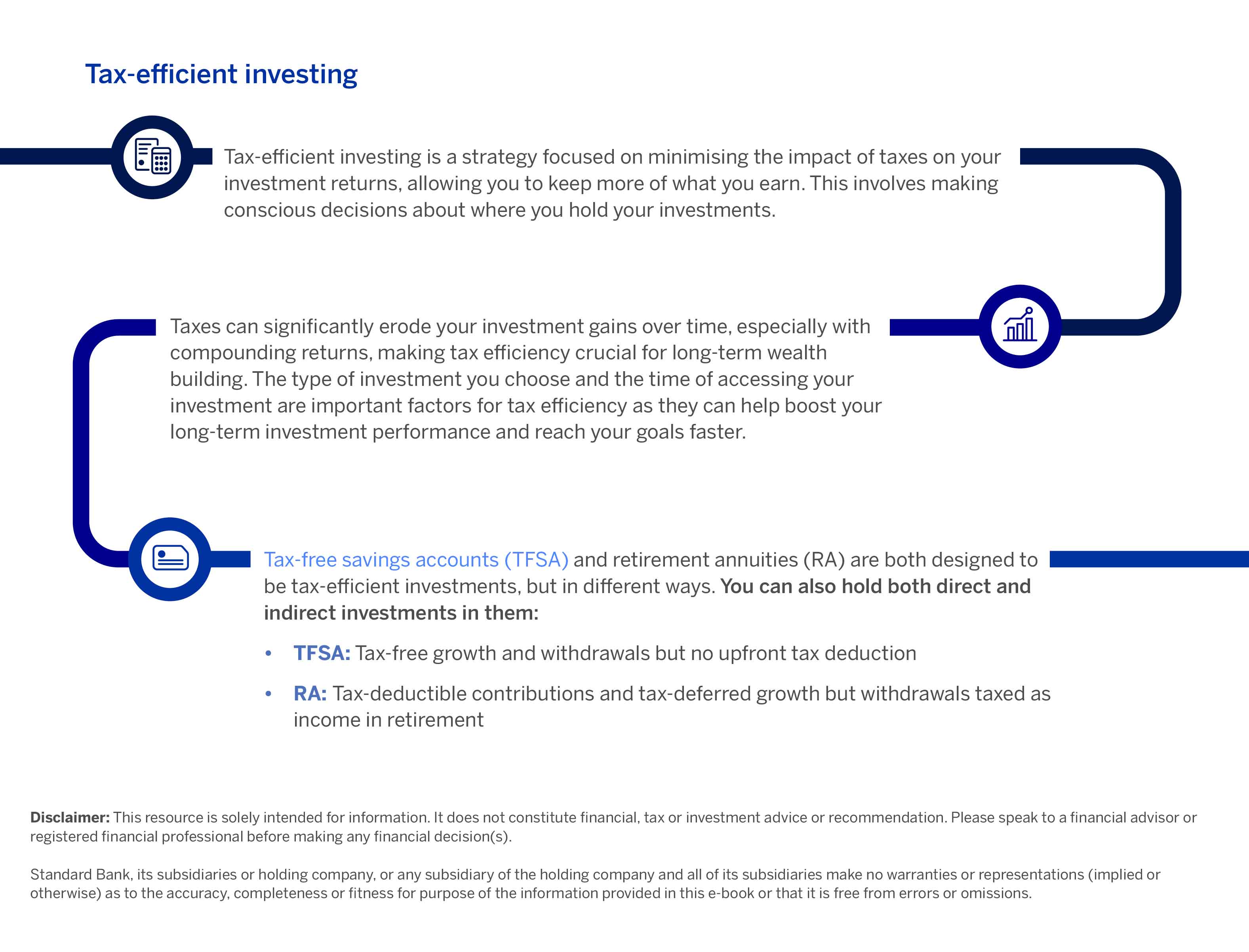 Retirement products may also offer tax advantages such as tax-deductible contributions. This means that the money you contribute to a registered retirement annuity (RA) could lower your taxable income, helping you save for the future while paying less tax today. Plus, the investment growth in your RA is tax-free until retirement, giving your money more room to grow.